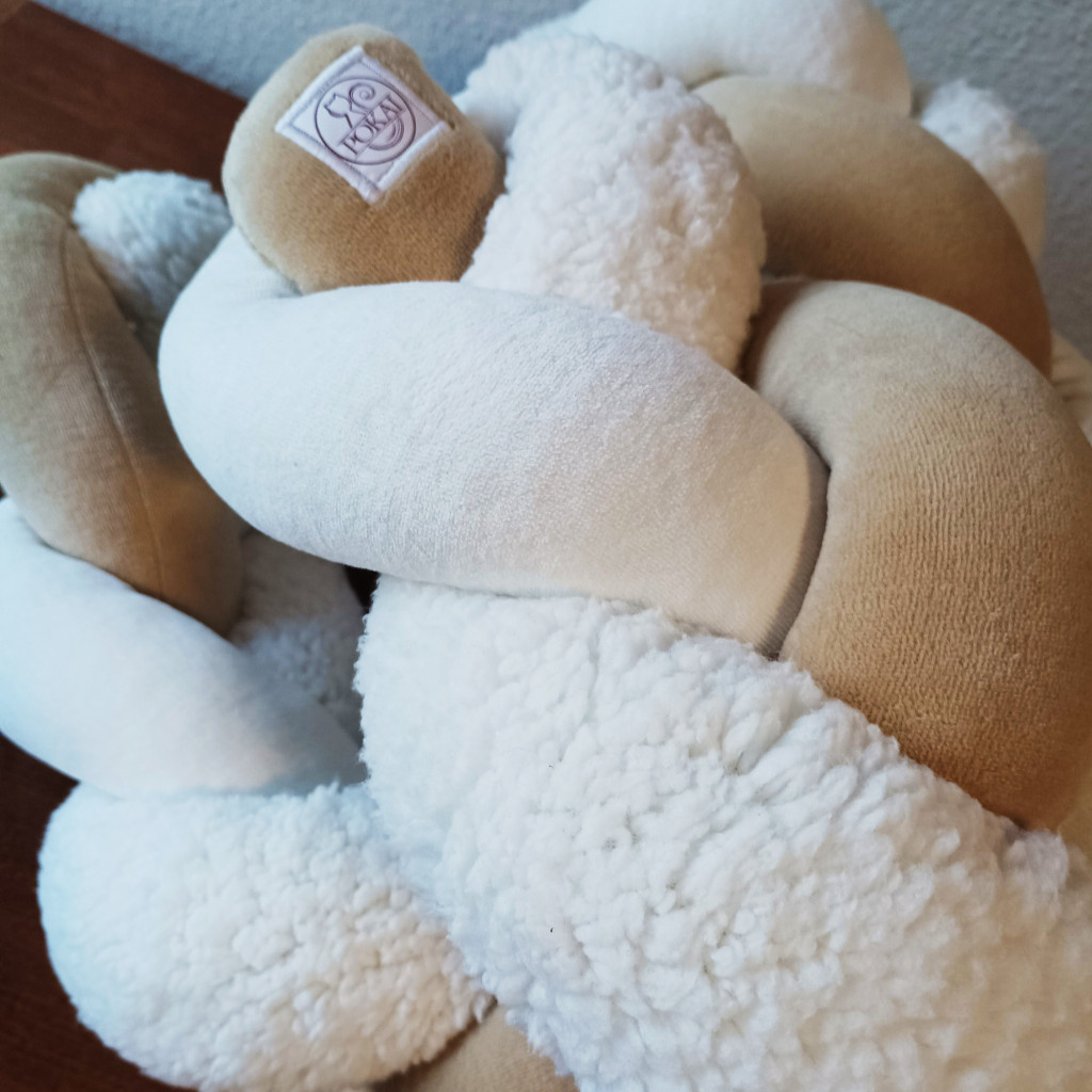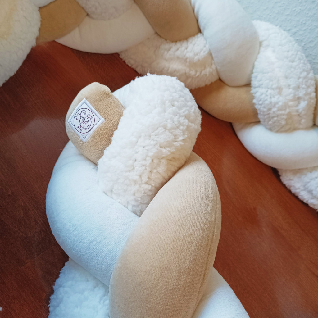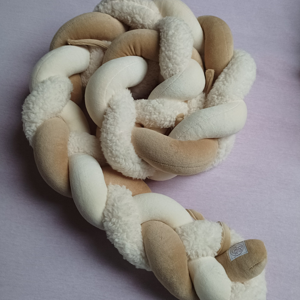 3 fonatos, ekrü színű sherpa és bézs, ekrü színű bébiplüss anyagokból készült fonott rácsvédő mely kényelmesen kibéleli a kiságyat.
