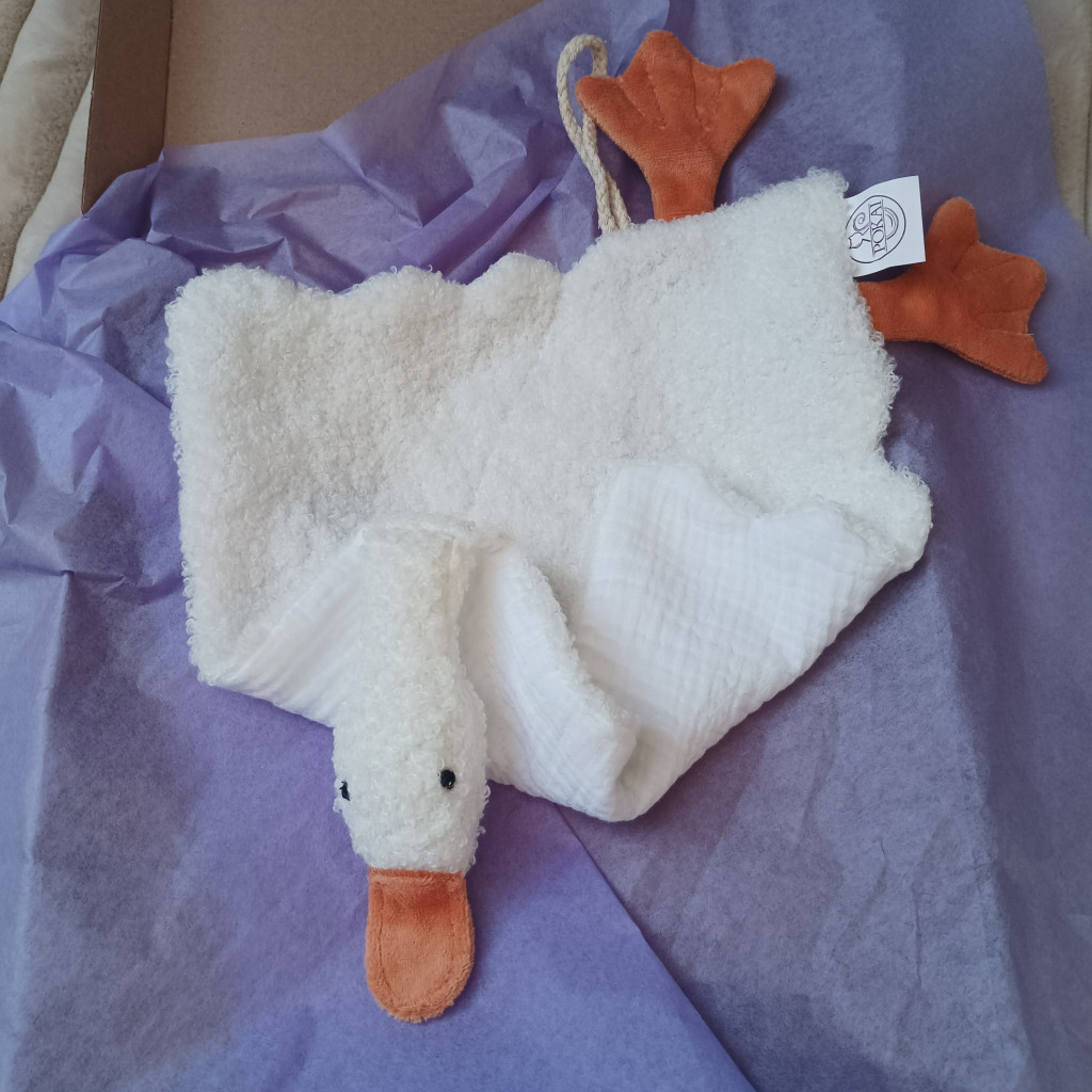 A csomag szíve a pihe-puha, buklé-sherpa és dupla muszlin anyagból készült Kacsa szundikendő. Mókas arca azonnal mosolyt csal a kicsikre, míg a rögzíthető cumi és a választható csörgő-zörgő lábacskák a praktikumot és a fejlődést szolgálják. A pihenést egy 60x60 cm-es, légáteresztő muszlin kendő teszi teljessé, melynek sarkán a kislányoknak plüssvirág, a kisfiúknak puha falevél kínál felfedeznivalót.